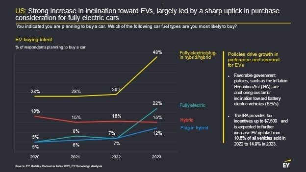 "There are a few critical drivers to adopt EVs on a large scale, from consumer sentiment, to regulatory incentives and cost," said Felipe Smolka, EY Americas Automotive eMobility Leader. "Government incentives, such as the Inflation Reduction Act (IRA), make a large impact not just on consumers, but across industries. As more EV accessibility and incentives arise, whether its developing charging stations on interstate highways or driving battery circularity, we will see EV adoption thrive."