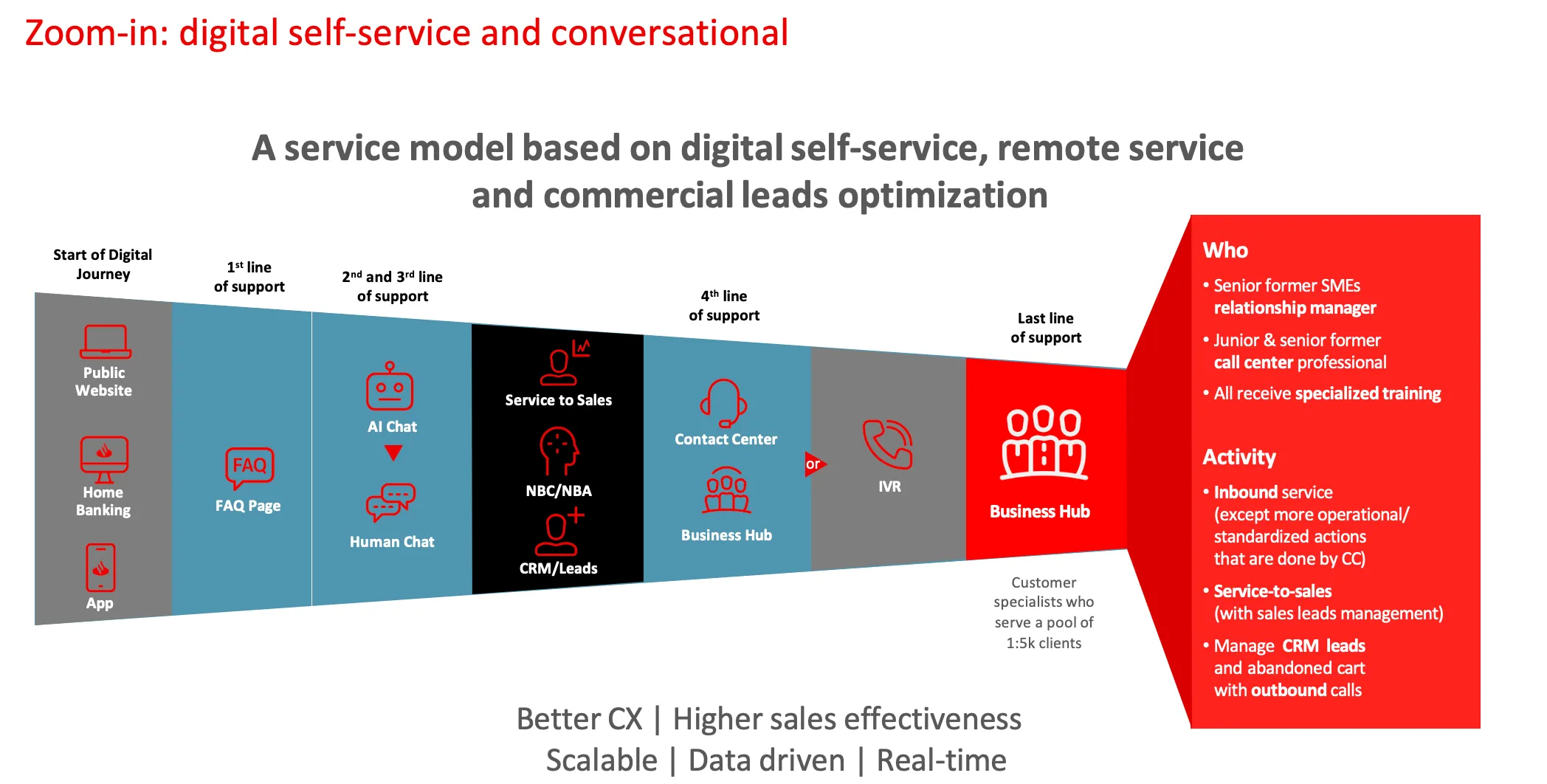 The bulk of the RMs’ sales leads are now generated by a digital platform using internal data and propensity models. The bank estimates that the introduction of digital technologies has doubled RM productivity in the past four years.