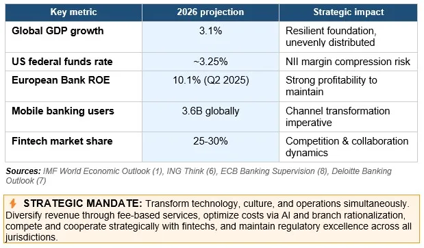 The global banking sector enters 2026 operating under conditions characterized by three defining forces: divergent monetary policy, the confluence of regulatory mandates, the imperative of AI industrialization. The strategic mandate is clear: transform technology, culture, and operations simultaneously. Diversify revenue through fee-based services, optimize costs via AI and branch rationalization, compete and cooperate strategically with fintechs, and maintain regulatory excellence across all jurisdictions.