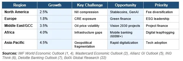 Banking conditions vary dramatically by region, requiring tailored strategies while maintaining global operational coherence. Growth is unevenly distributed, disproportionately favoring advanced economies and digitally ready sectors.