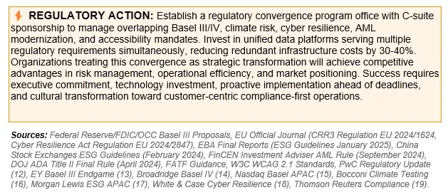 2026 represents a pivotal inflection point with Basel III/IV finalization, mandatory climate risk integration, cybersecurity frameworks, AML modernization, and digital accessibility mandates converging simultaneously across all major jurisdictions.