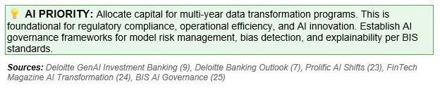 AI success depends entirely on data quality and accessibility. Most banks struggle with fragmented data across legacy systems, inconsistent governance, and insufficient metadata. Without addressing these foundations, AI initiatives remain trapped in pilot phase. The goal for 2027 is creating "AI-ready data"—accurate, timely, broad, and securely governed—supporting breakthrough agentic AI applications that perform complex, multi-step tasks autonomously. Poor data infrastructure causes models to stall or produce hallucinations, posing significant operational and reputational risks.