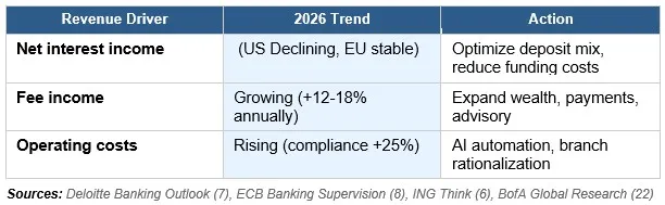 This divergence demands that CFOs and CSOs urgently pivot strategies toward robust non-interest income streams, especially in jurisdictions facing margin compression.