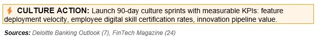 Technology and strategy fail without cultural alignment. Banking's traditional risk-averse, hierarchical culture conflicts with the speed, experimentation, and customer-centricity required for digital transformation. Successful banks systematically rebuild organizational culture around agility, innovation, and accountability.